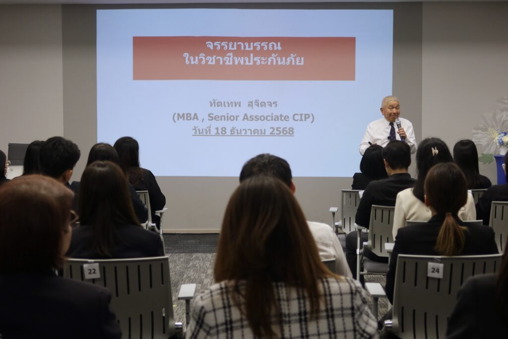สถาบันประกันภัยไทยได้รับเกียรติอย่างยิ่งจาก คุณทัตเทพ สุจิตจร ผู้ทรงคุณวุฒิ ในวงการประกันภัย ให้เกียรติมาถ่ายทอดองค์ความรู้ในหัวข้ “จรรยาบรรณของนักประกันภัย” เพื่อเสริมสร้างความตระหนักรู้ด้านจริยธรรม และเตรียมความพร้อมให้แก่ผู้สำเร็จการศึกษา ก่อนก้าวสู่เส้นทางวิชาชีพอย่างมั่นใจ ภายใต้มาตรฐานและจริยธรรมที่เหมาะสม