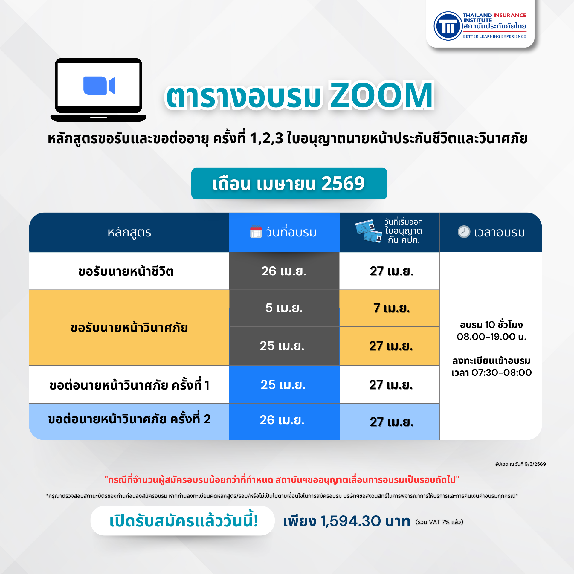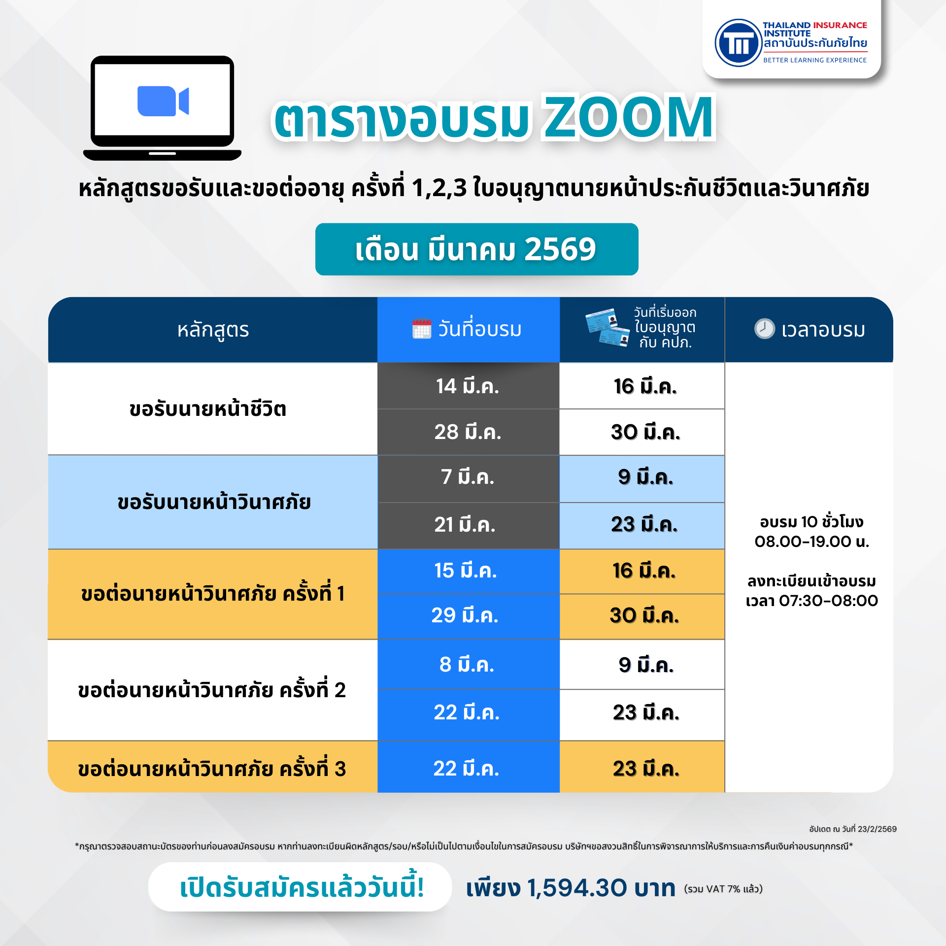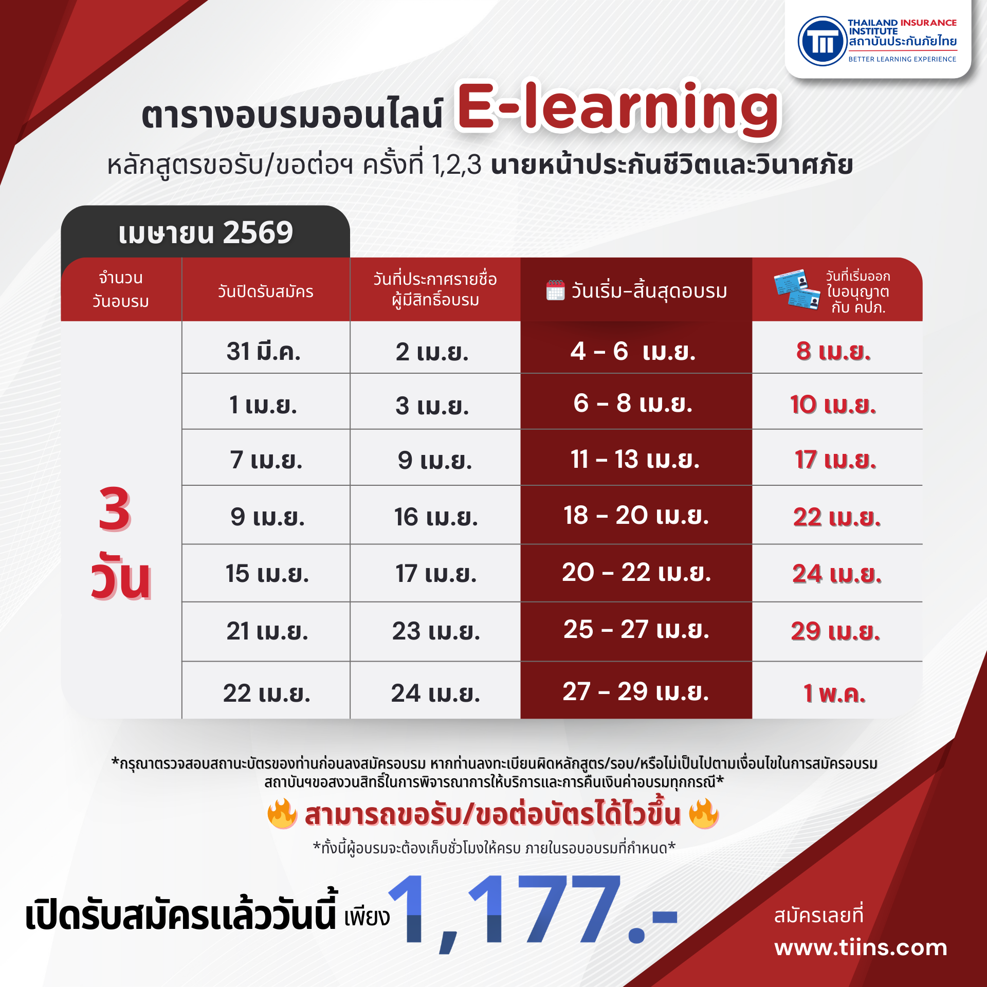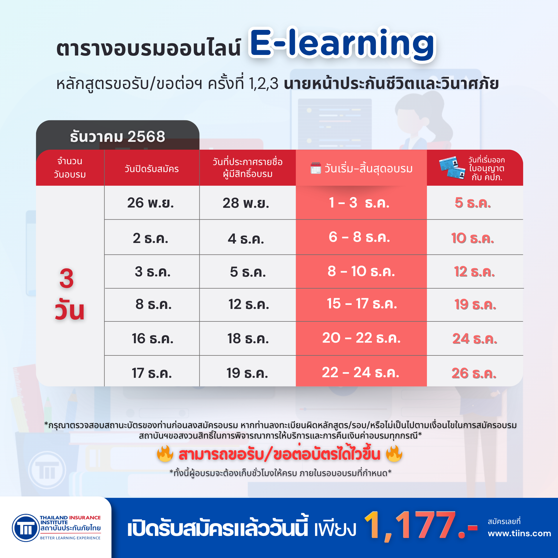 *กรุณาตรวจสอบวันหมดอายุของใบอนุญาตท่าน ก่อนลงทะเบียนอบรม กรณีขอต่อฯจะต้องยื่นต่อกับสำนักงานคปภ.ก่อนใบอนุญาตหมดอายุ ทั้งนี้ หากท่านเลือกรอบอบรมที่ท่าน ไม่สามารถดำเนินการต่ออายุใบอนุญาตได้ทันเวลา/ลงทะเบียนผิดหลักสูตร/รอบ/หรือไม่เป็นไปตามเงื่อนไขในการสมัครอบรม ทางสถาบันฯขอสงวนสิทธิ์ในการพิจารณาการให้บริการและการคืนเงินค่าอบรมและความรับผิดชอบในทุกกรณี