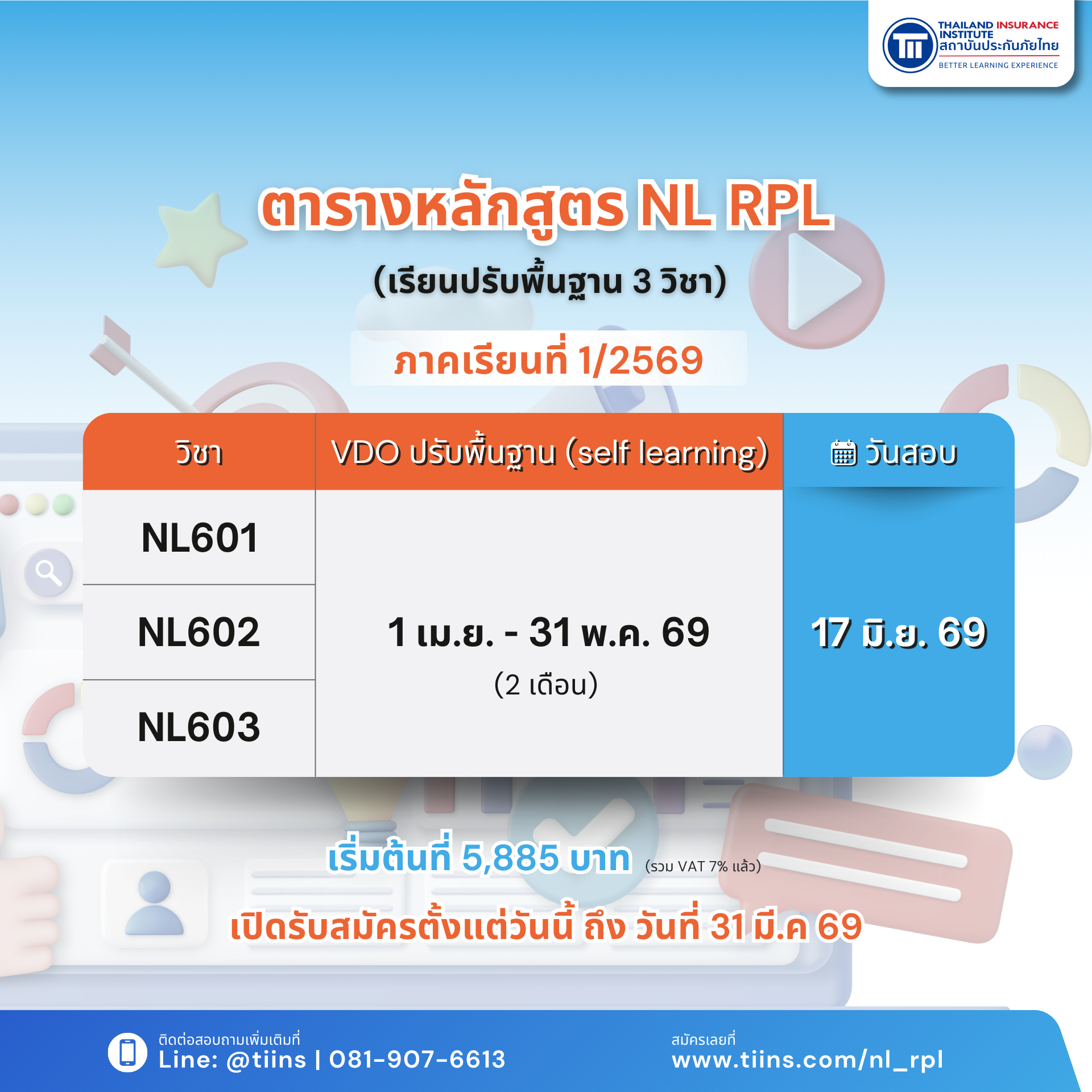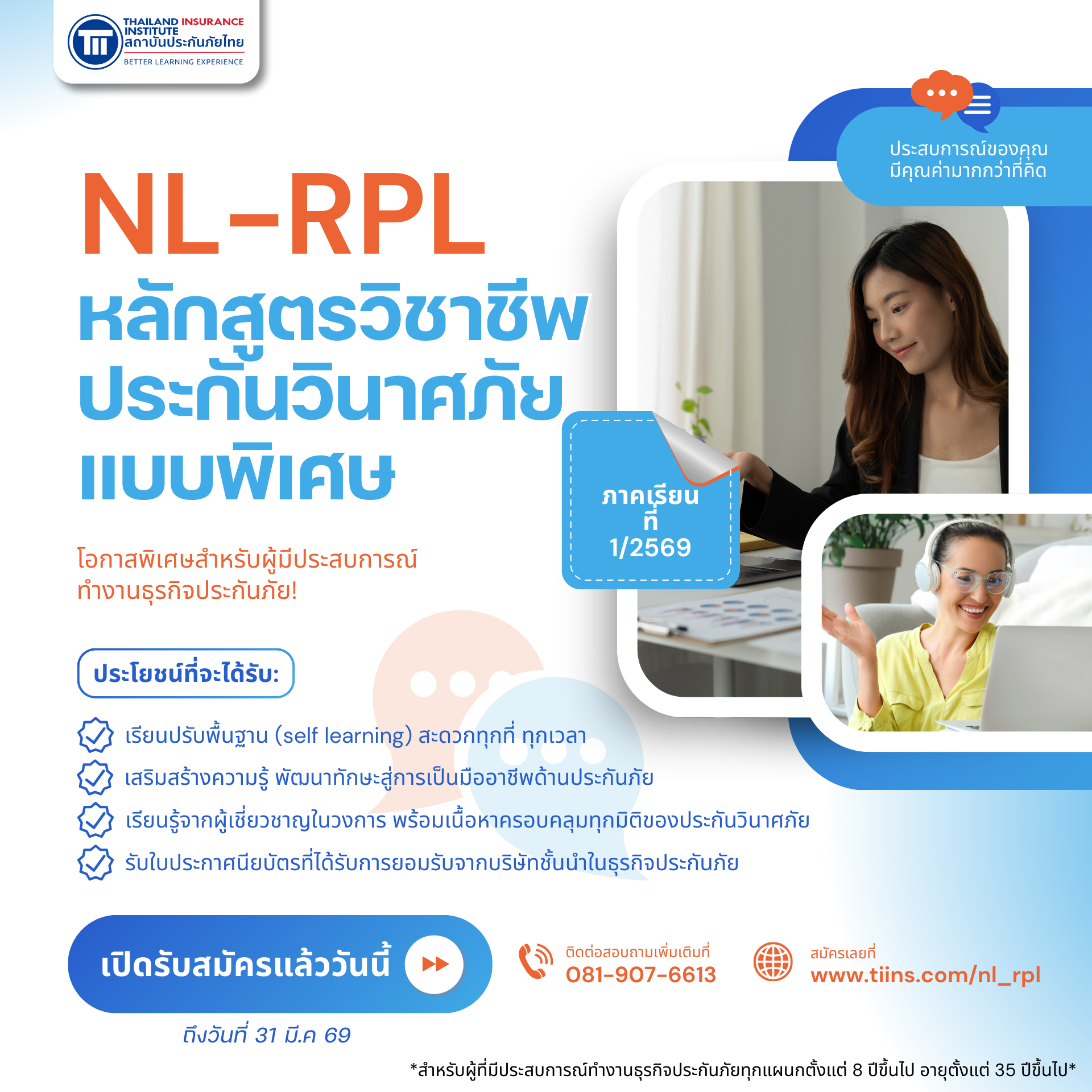 - NL RPL เป็นหลักสูตรสำหรับบุคคลากรด้านประกันภัยที่มีอายุการทำงานอย่างน้อย 8 ปี