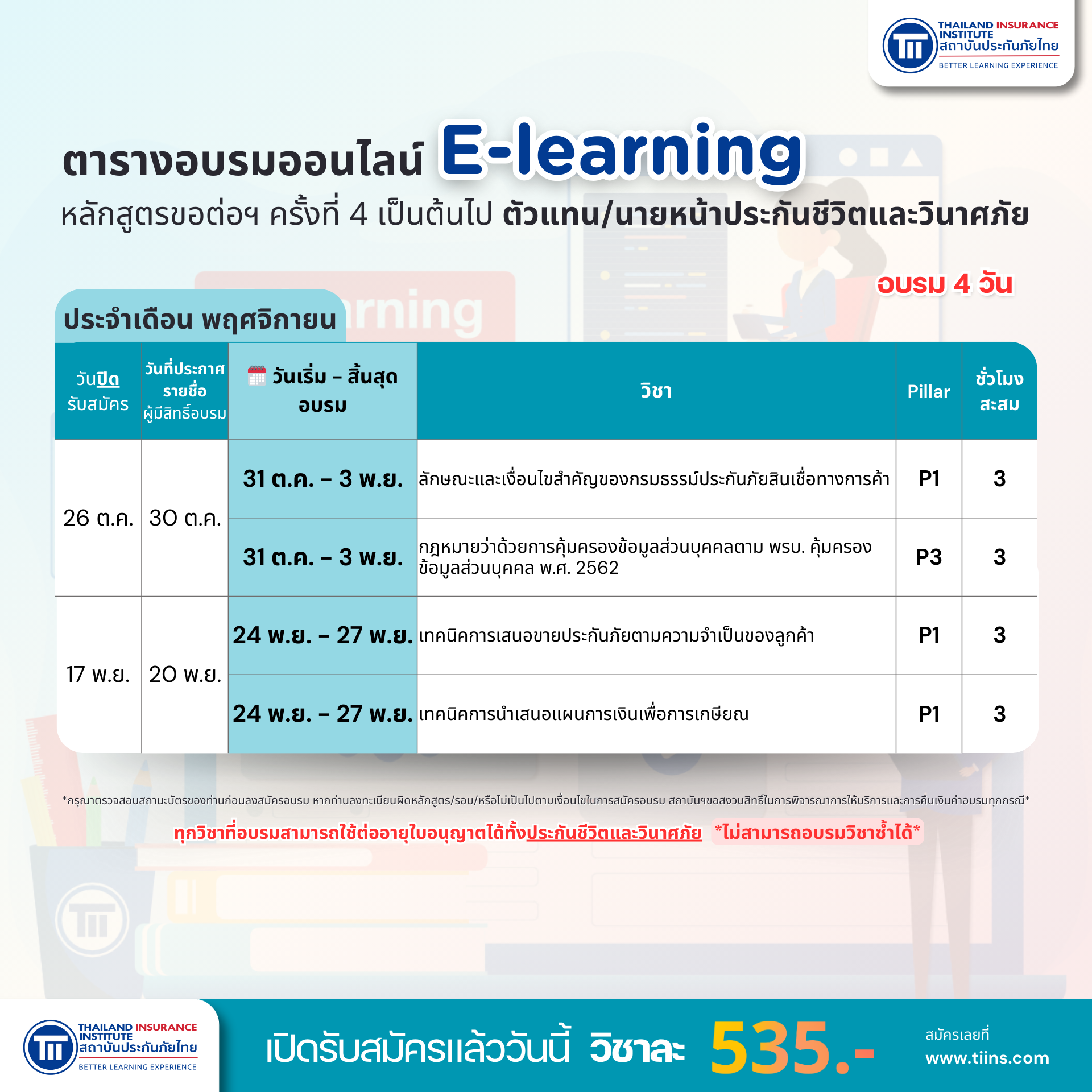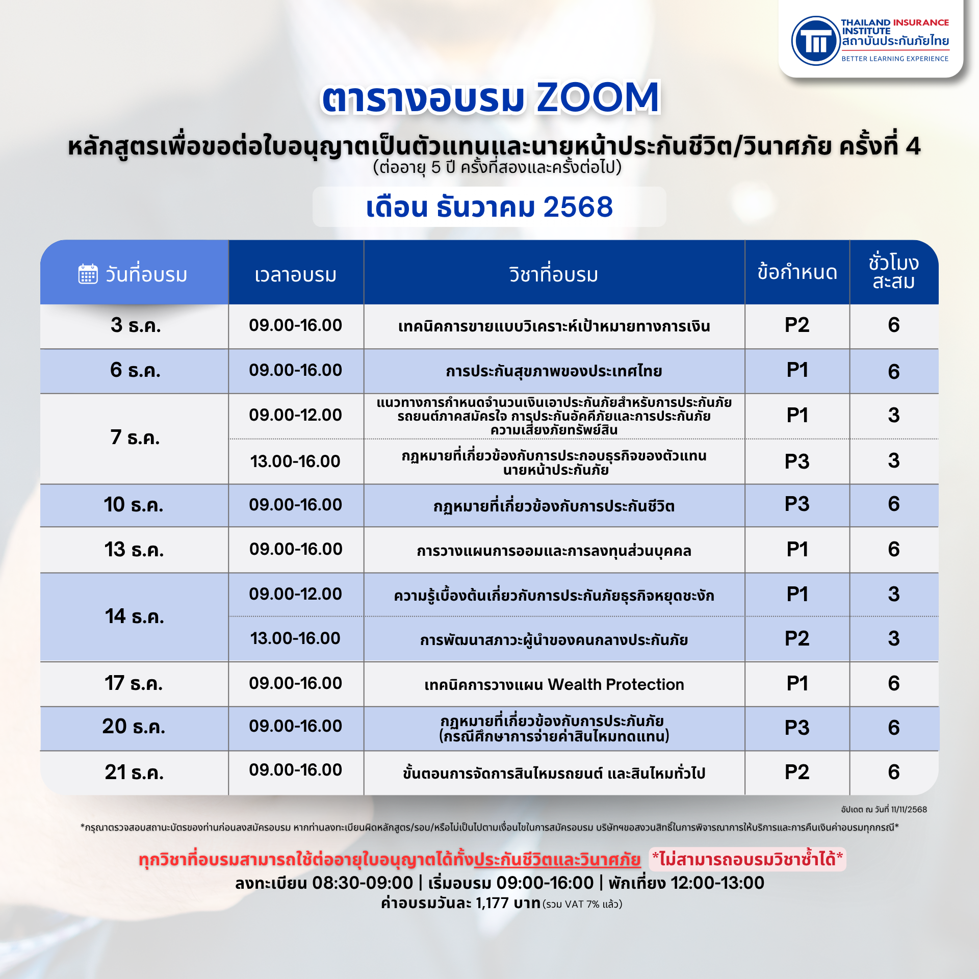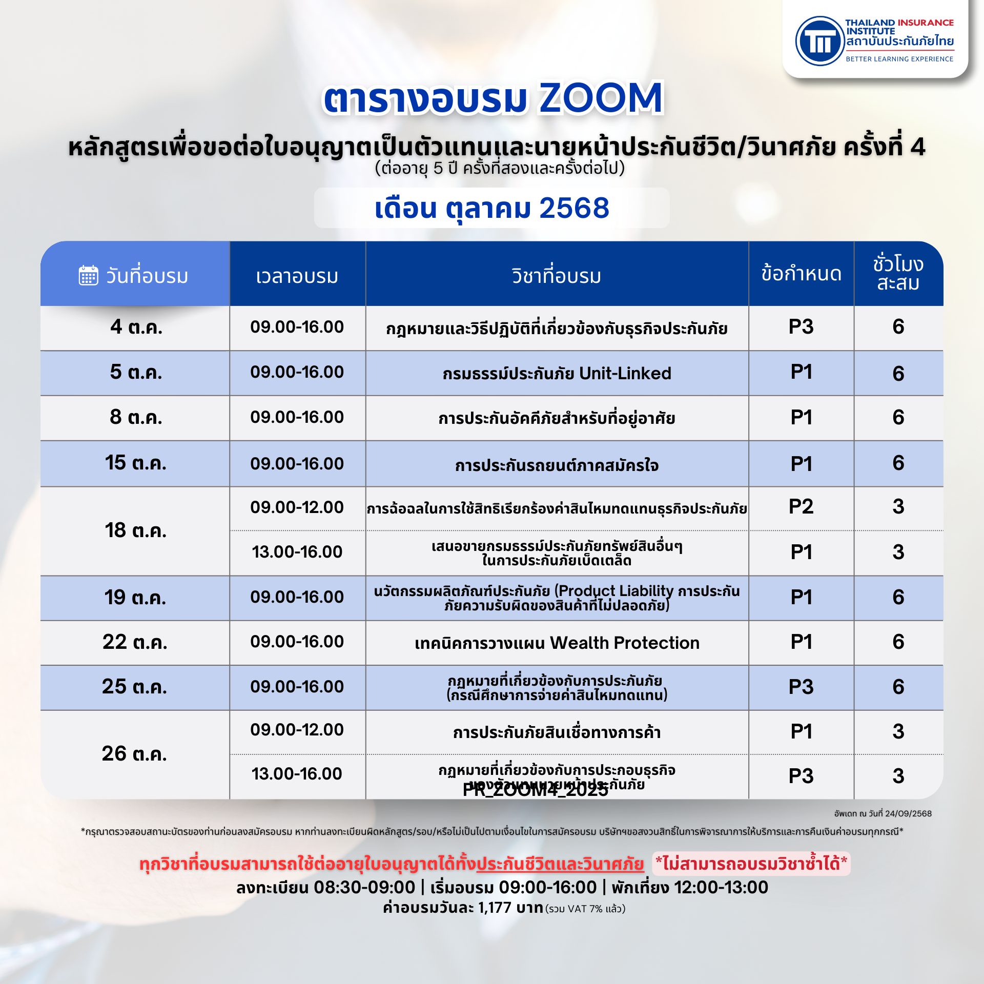 *กรุณาตรวจสอบวิชาที่ท่านสะสมเพื่อยื่นขอต่ออายุใบอนุญาตเป็นตัวแทนและนายหน้าประกันชีวิตและวินาศภัย ครั้งที่ 4 เป็นต้นไป (5 ปี) หากท่านลงทะเบียนผิดวิชา/หรือไม่เป็นไปตามเงื่อนไขในการสมัครอบรม สถาบันฯขอสงวนสิทธิ์ในการพิจารณาการให้บริการและการคืนเงินค่าอบรมทุกกรณี*