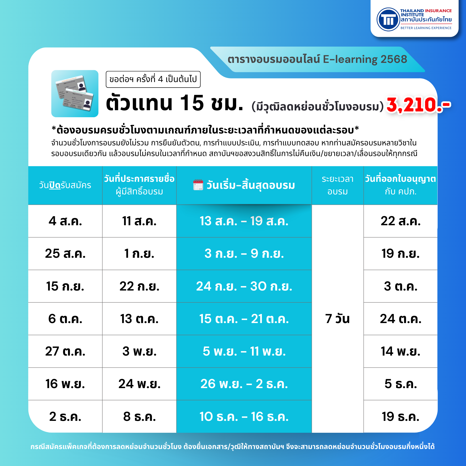 - ตัวแทน 15 ชั่วโมง (ระยะเวลาอบรม 7 วัน)