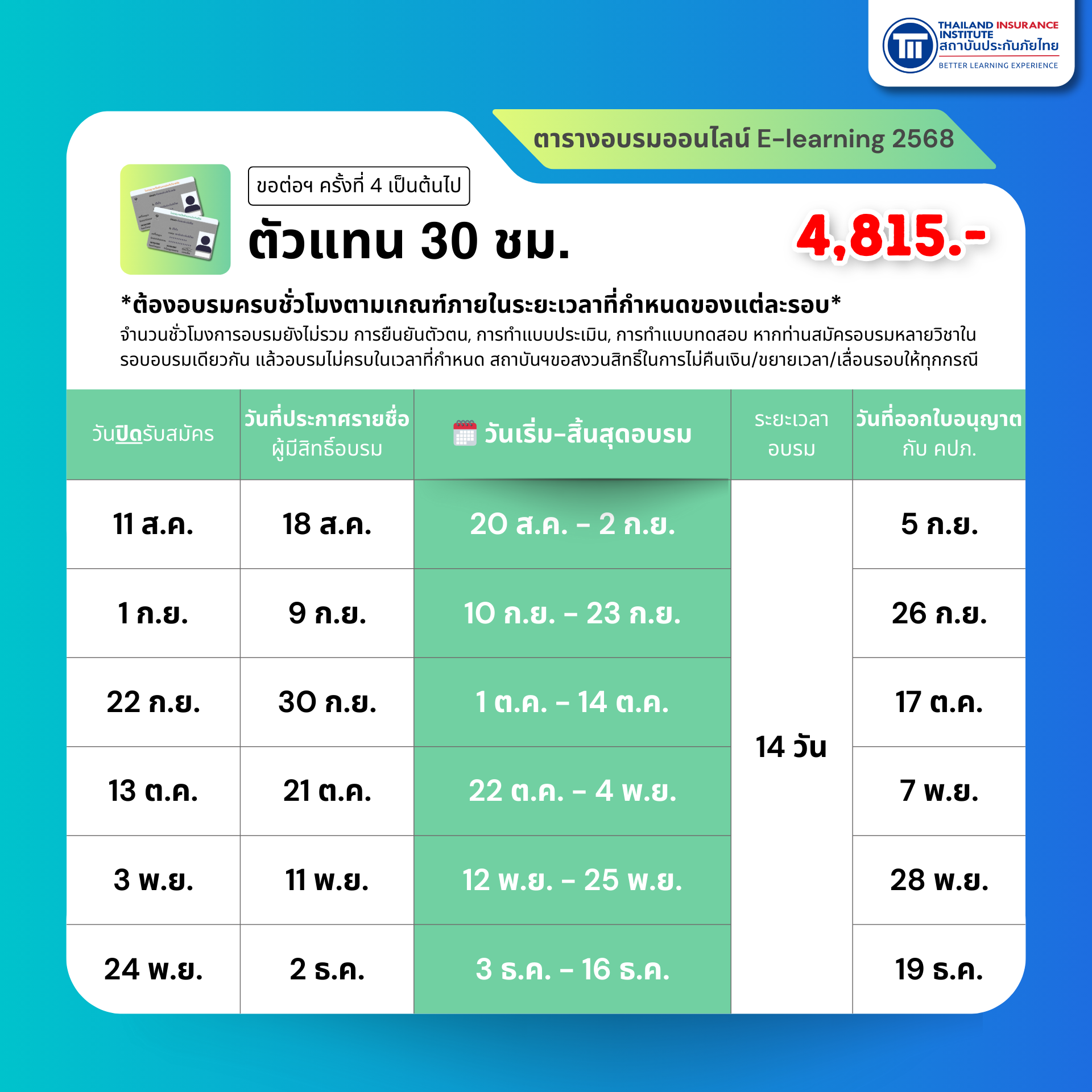 - ตัวแทน 30 ชั่วโมง (ระยะเวลาอบรม 14 วัน)