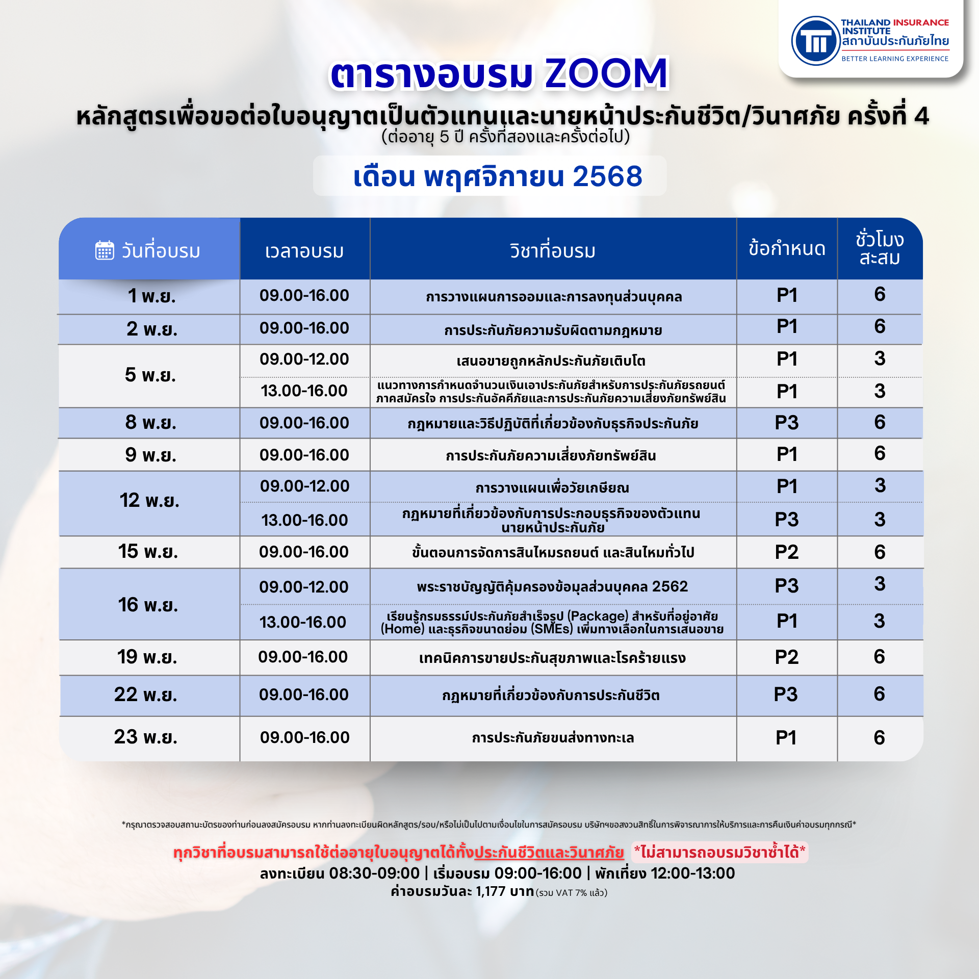 - หลักสูตรนี้เหมาะสำหรับผู้ที่จะขอต่ออายุใบอนุญาตเป็นตัวแทนและนายหน้าประกันชีวิตและวินาศภัย ครั้งที่ 4 เป็นต้นไป (5 ปี)