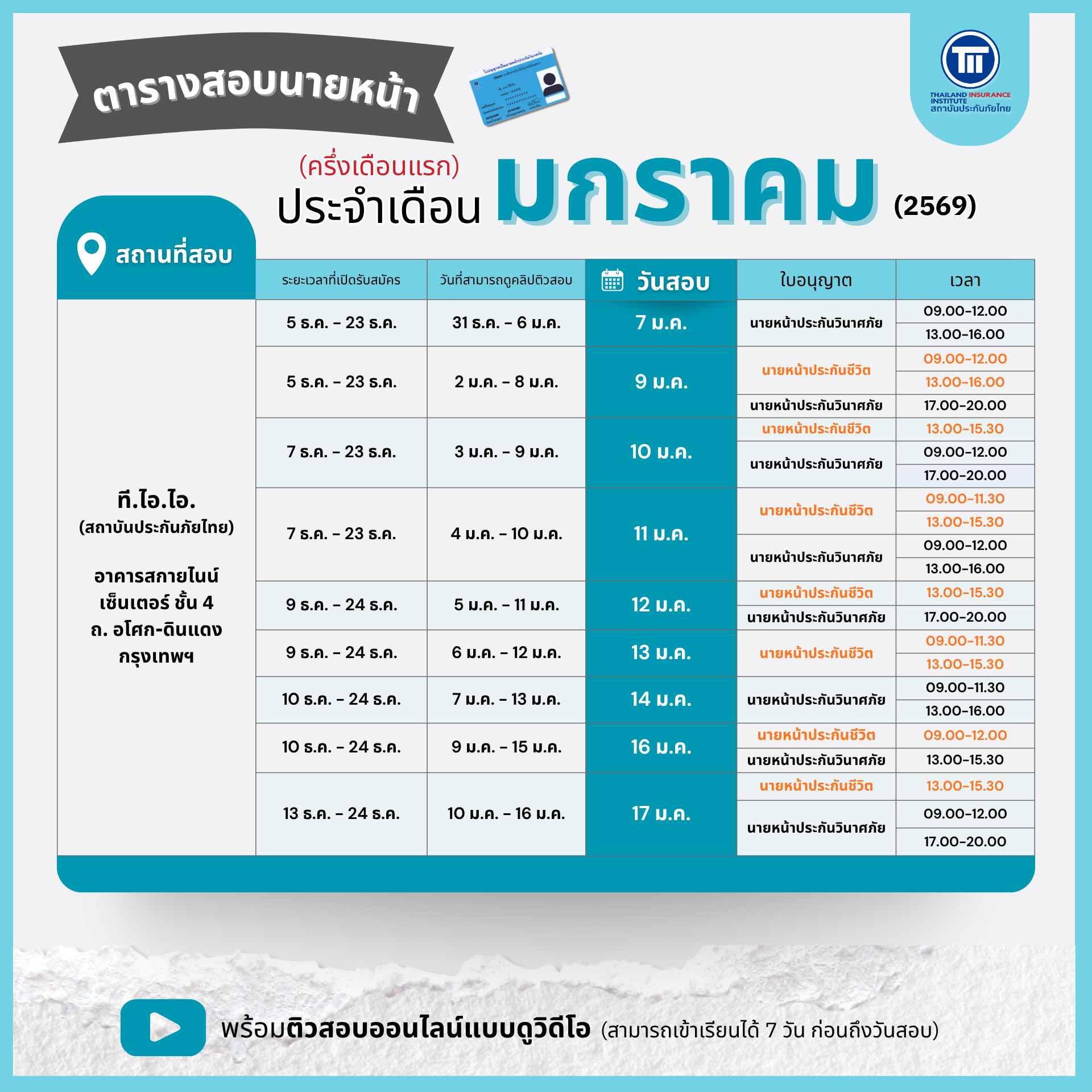 2. สอบนายหน้า ที่ บริษัท ที.ไอ.ไอ. จำกัด (สถาบันประกันภัยไทย) อาคาร SKYY9 Center ถ. อโศก-ดินแดง กรุงเทพฯ *สนามสอบต่างจังหวัดกรุณาตรวจสอบรายละเอียดในตารางอีกครั้ง*