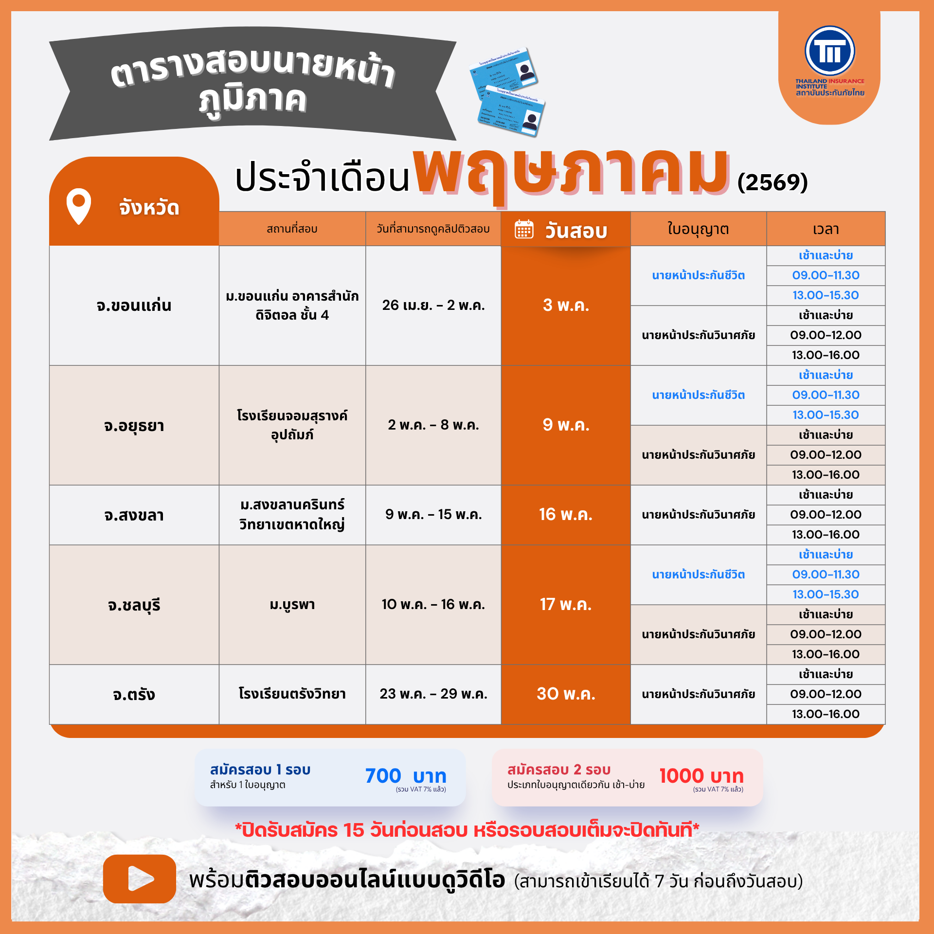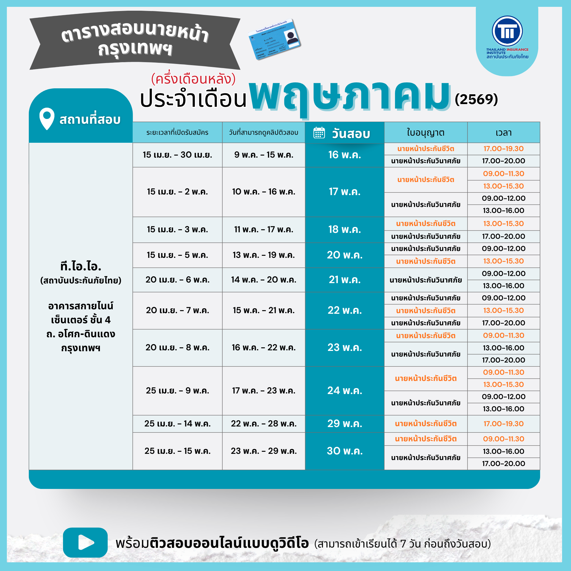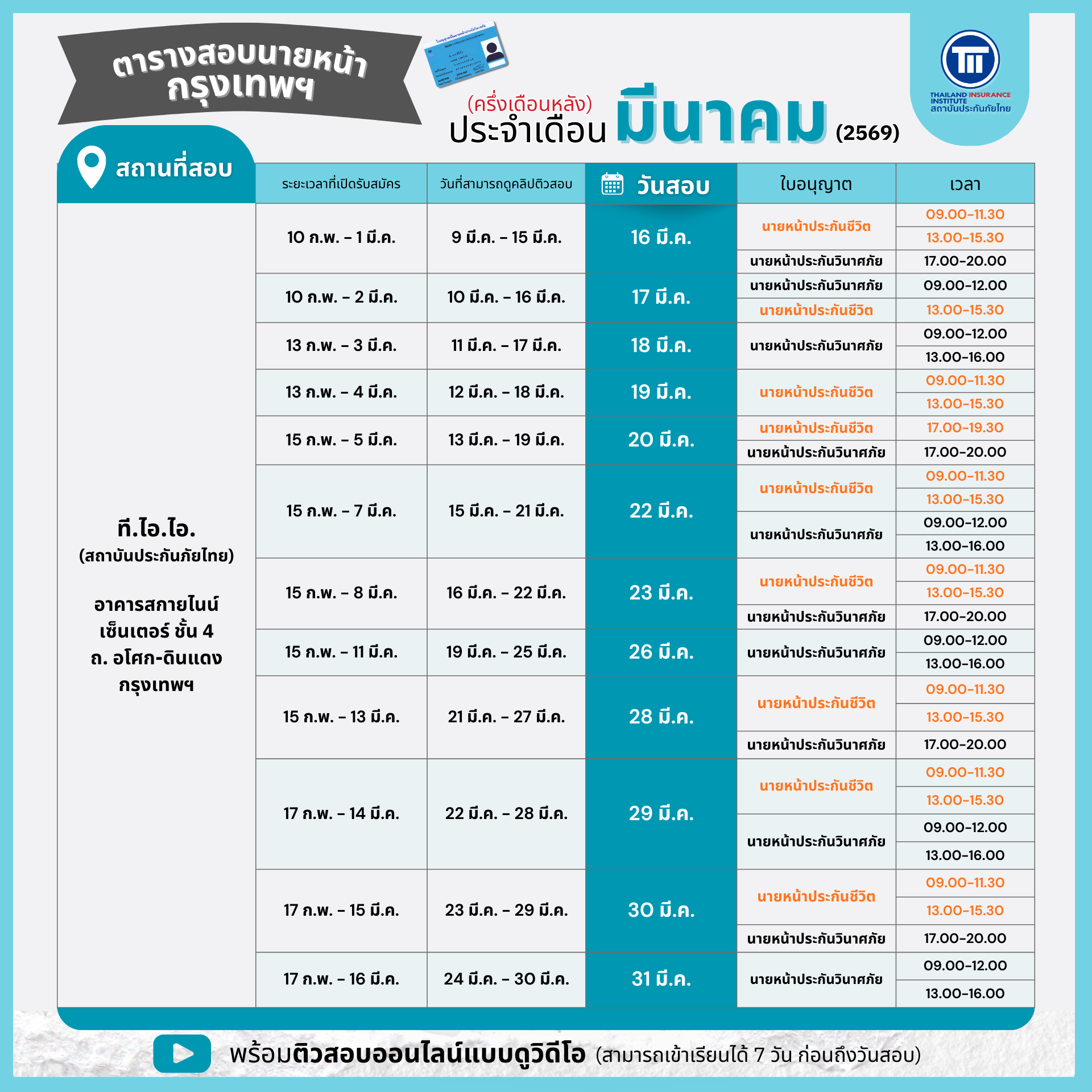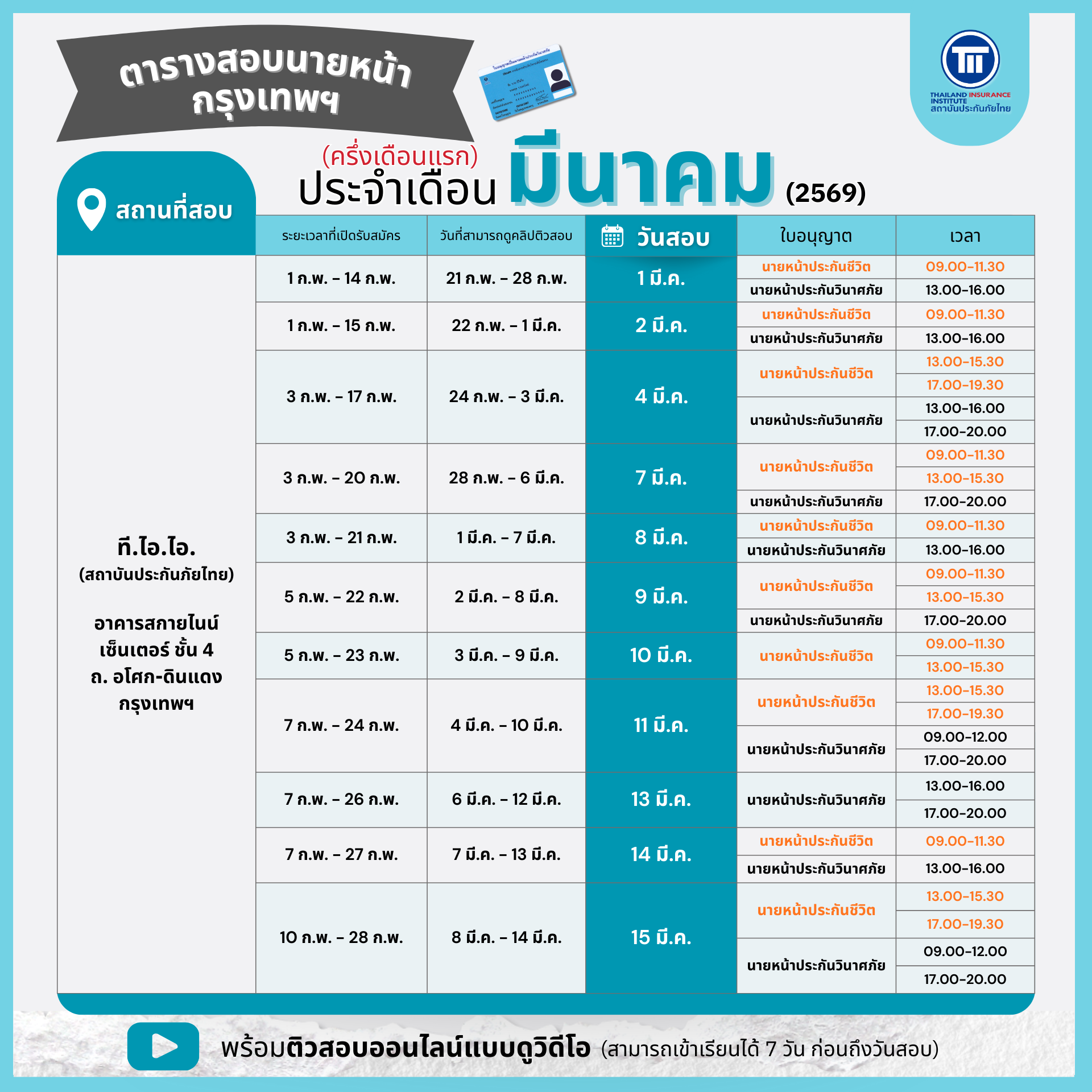 - สอบนายหน้า ที่ บริษัท ที.ไอ.ไอ. จำกัด (สถาบันประกันภัยไทย) อาคาร SKYY9 Center ถ. อโศก-ดินแดง กรุงเทพฯ *สนามสอบต่างจังหวัดกรุณาตรวจสอบรายละเอียดในตารางอีกครั้ง*